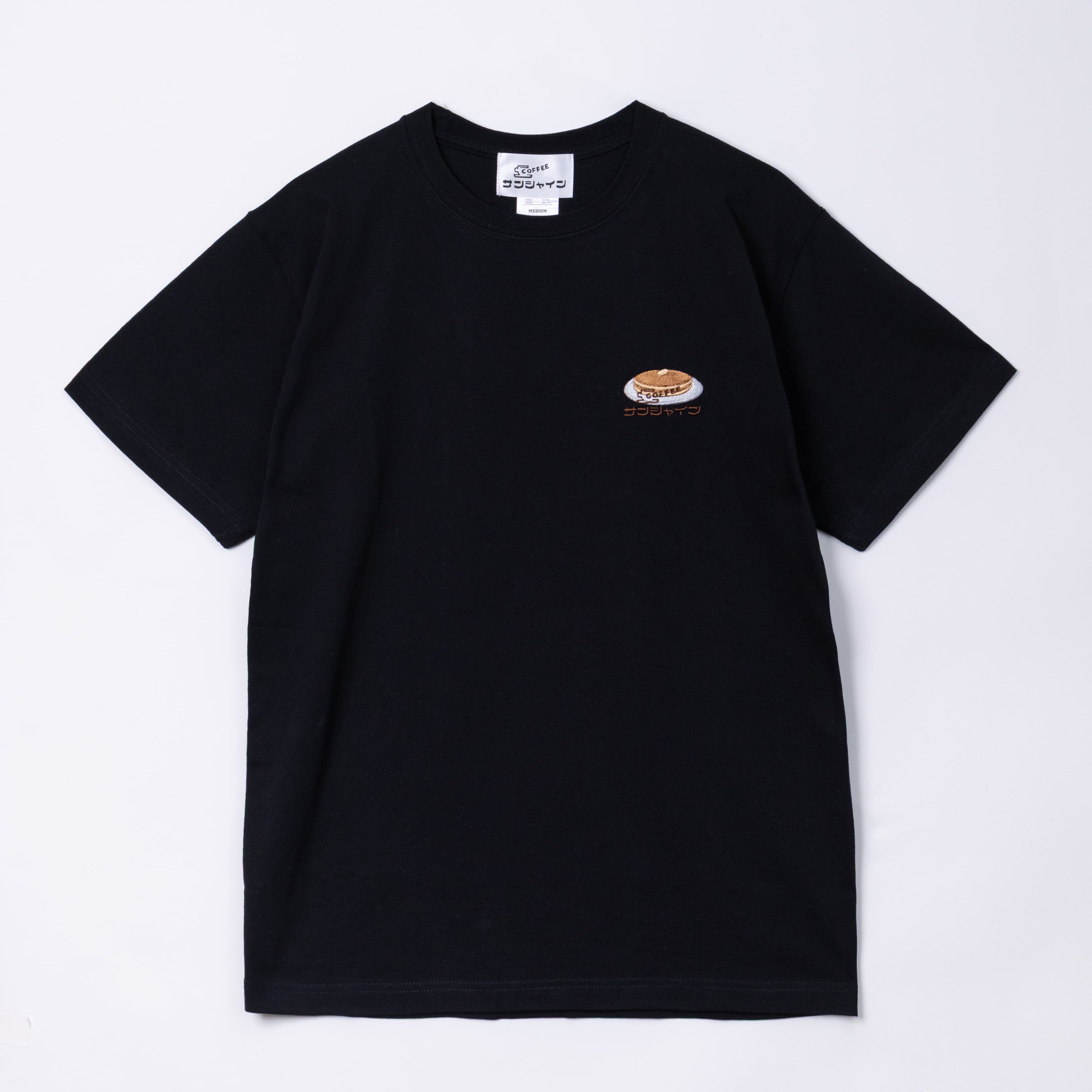 喫茶サンシャインの看板メニュー 「ホットケーキ」 を、胸元に小さく上品な刺繍であしらったオリジナルTシャツです。