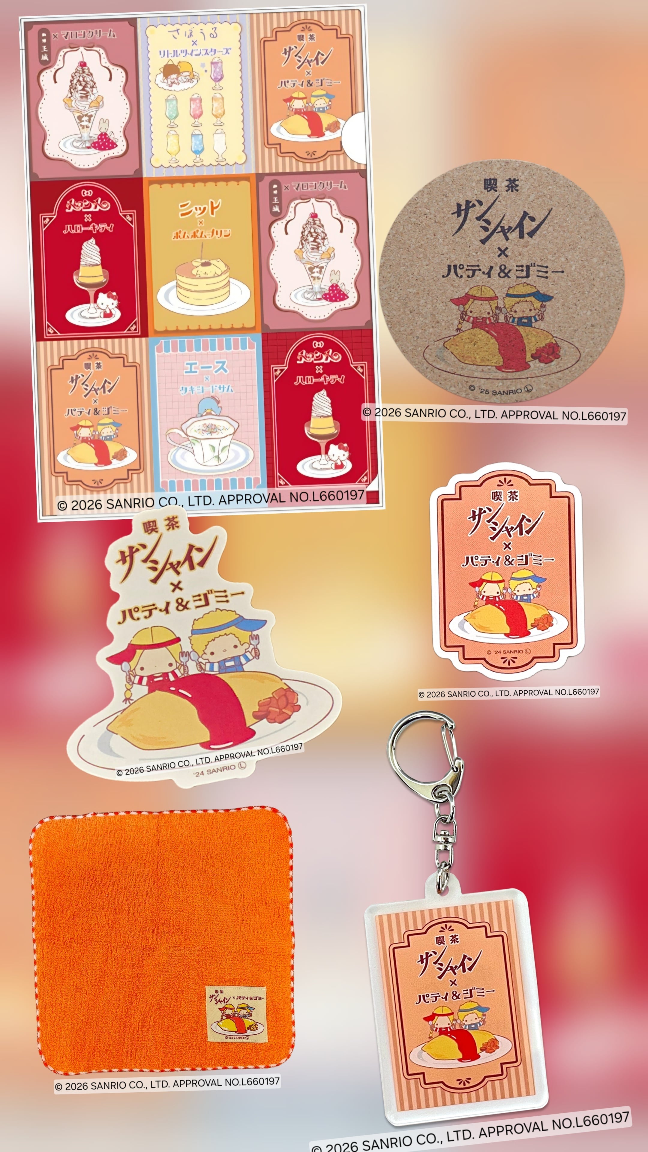 「喫茶サンシャイン」とのコラボレーションによって、サンリオキャラクター「パティ&ジミー」の魅力が詰まった素敵なセットが登場しました!このセットには、クリアファイル、ミニタオル、キーホルダー、コルクコースター、ステッカー2種類の計6点が含まれており、どれも日常生活で大活躍するアイテム揃いです。