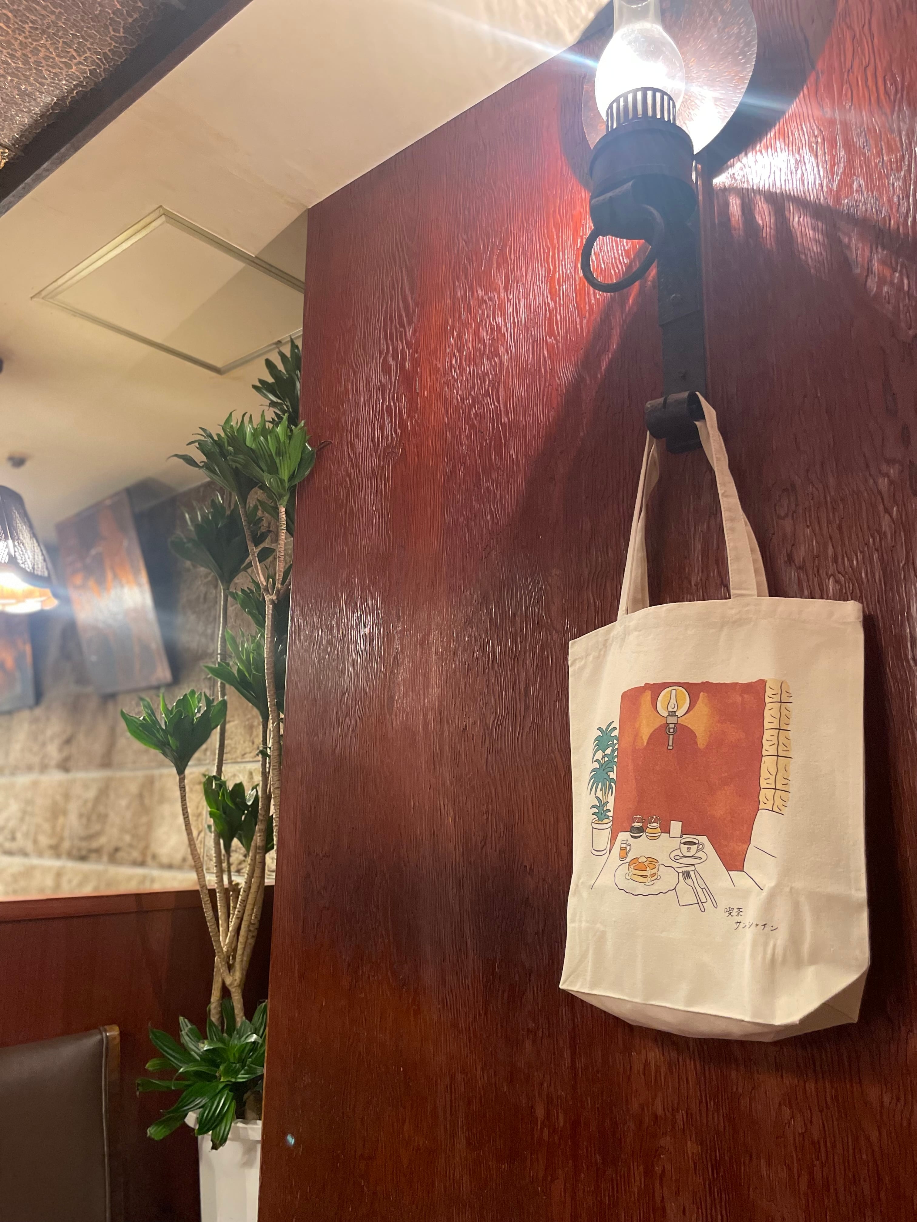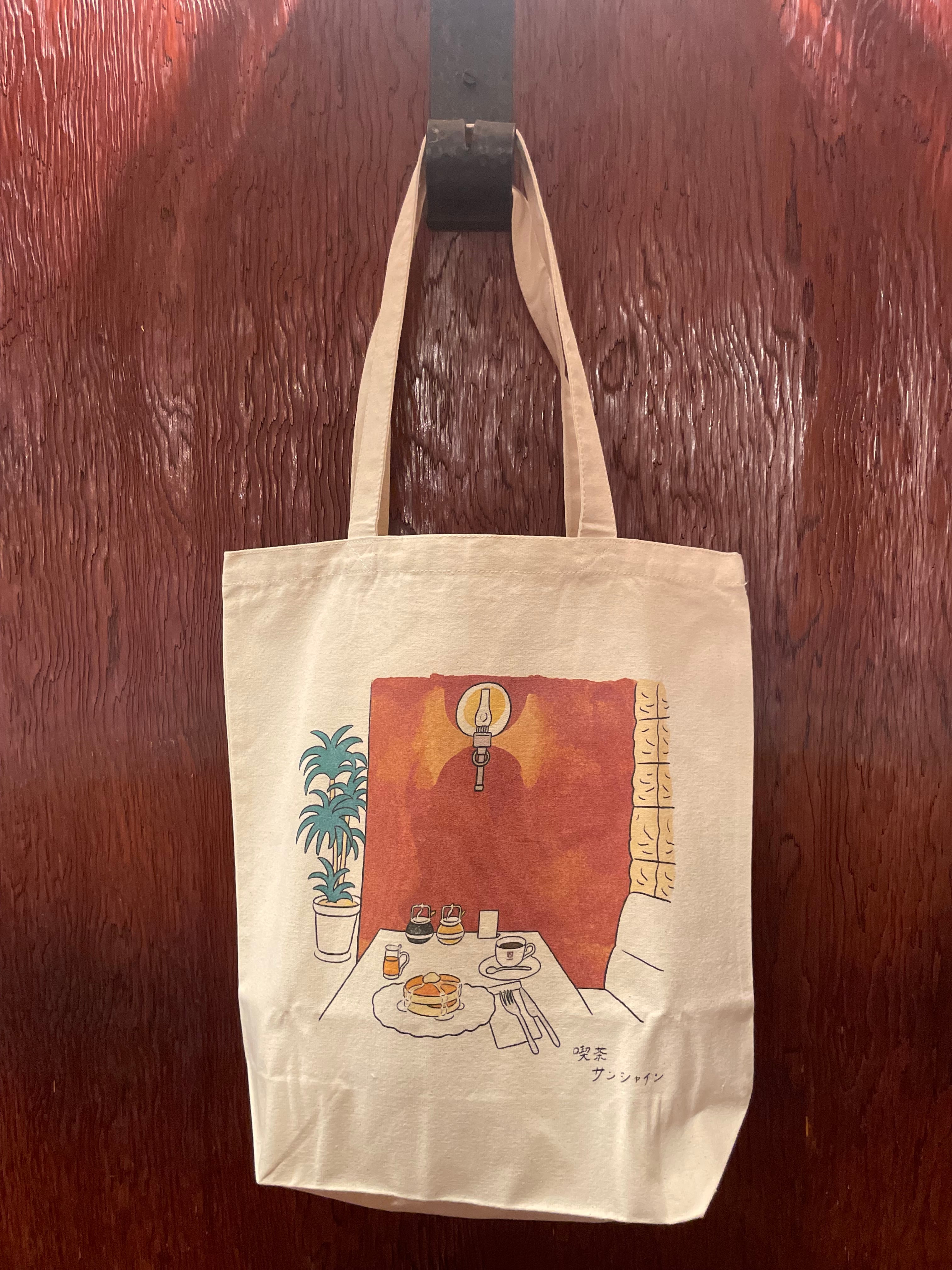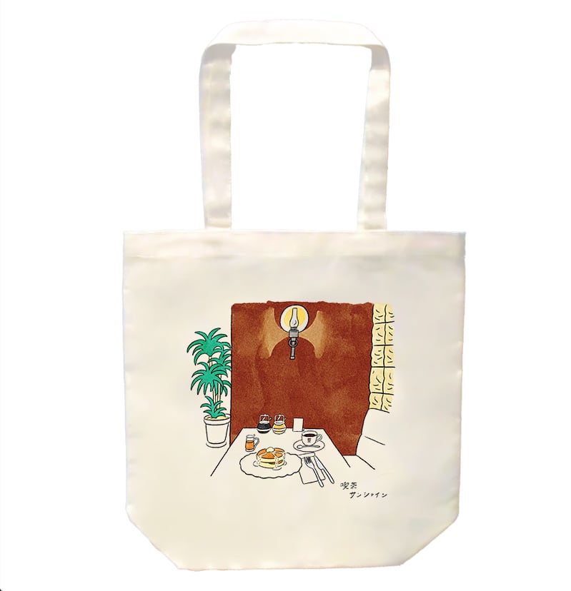 旧店舗の一角をデザインしたトートバッグです。テーブルにはホットケーキが。